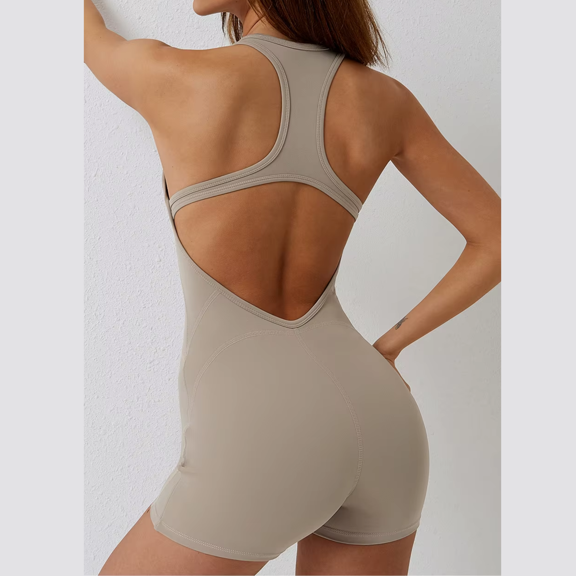 Introducing the ultimate activewear essential: our racer back sleeveless active romper. Designed for the modern athlete. this romper offers a sleek fit and optimal support. The quick-drying material ensures you stay dry and comfortable during the most rigorous workouts. The racer back provides excellent ventilation. and the sleeveless style enhances your range of motion. Perfect for running. cycling. or a day at the gym. this romper combines convenience with a trendy look. ensuring you feel great while achieving your fitness goals.